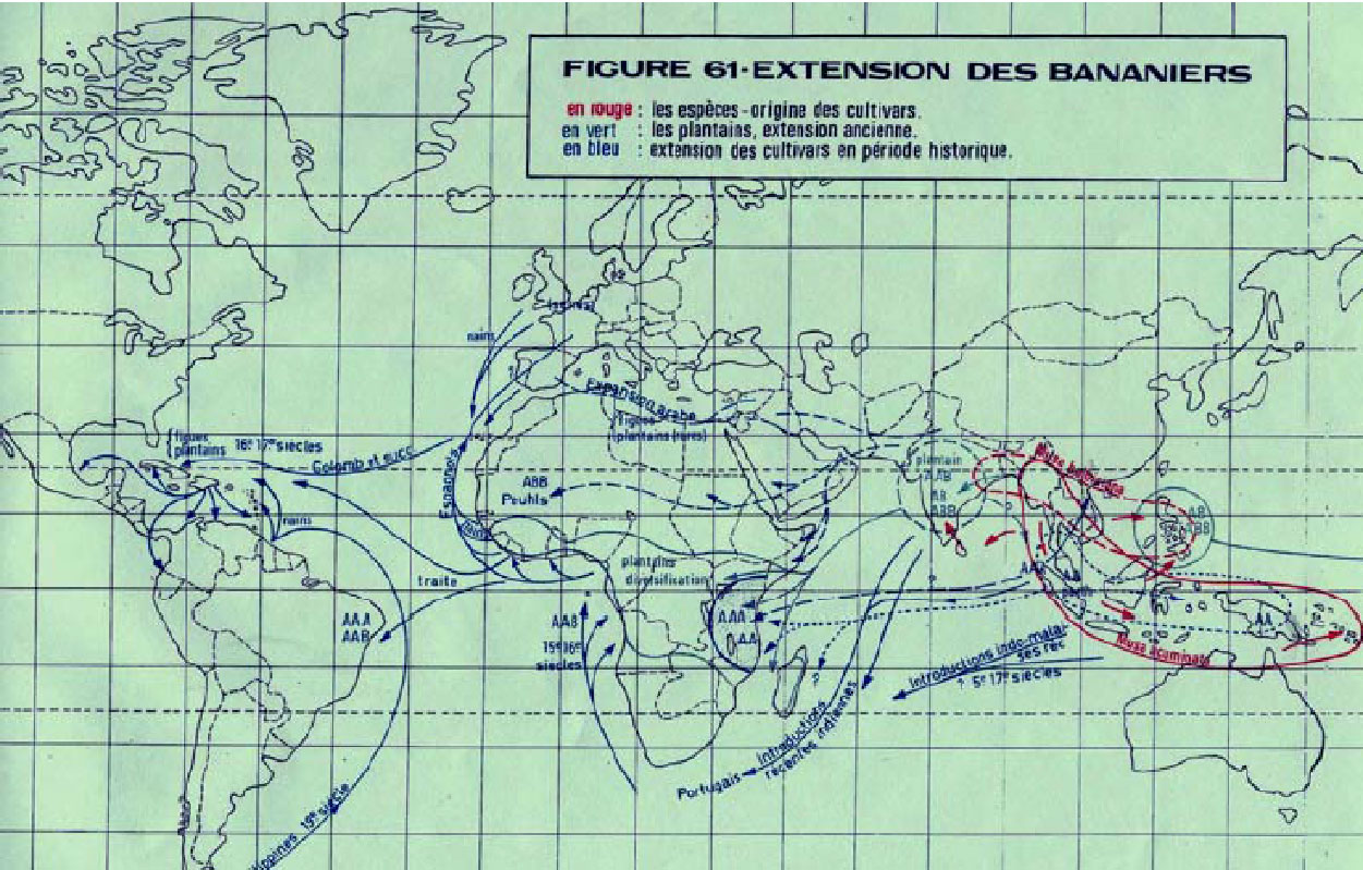 Champion em seus estudos feitos sobre o transito dos diferentes grupos genômicos pelos continentes, elaborou o mapa abaixo, o qual nos informa que muitas cultivares podem ter vindo do continente africano para o americano pelo Atlântico e também pelo Pacífico através do Sul do nosso continente.